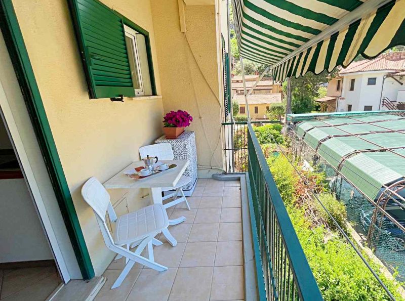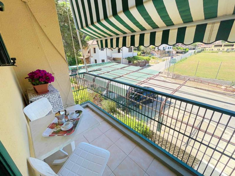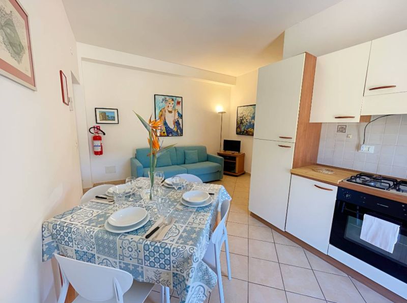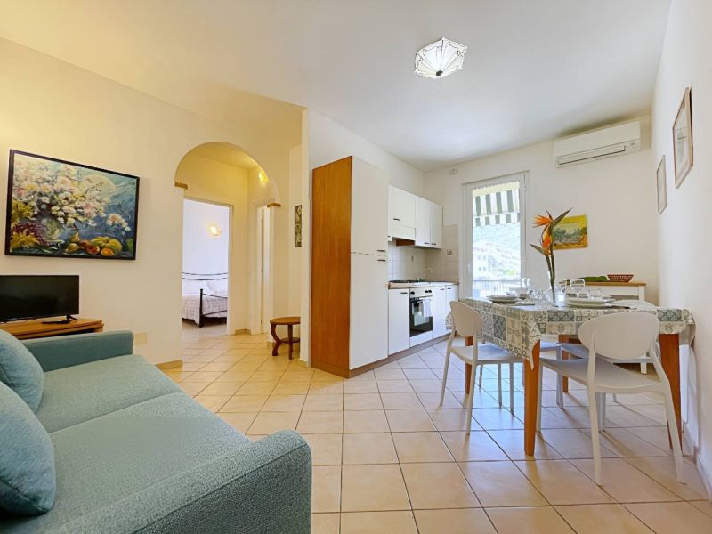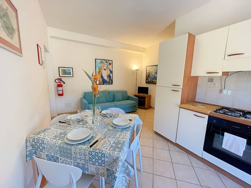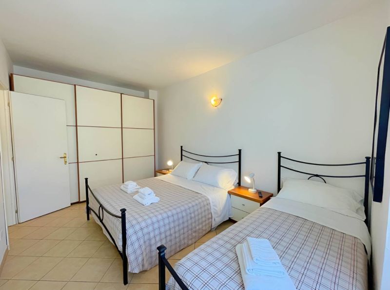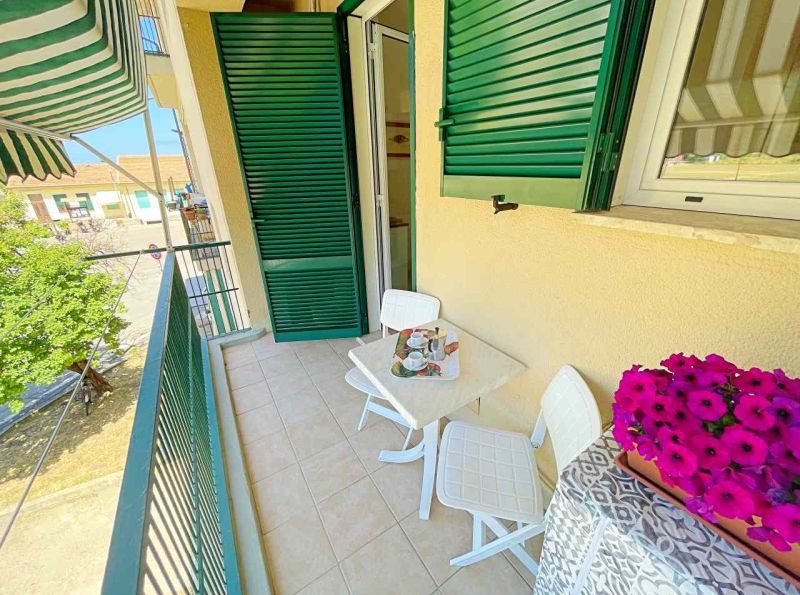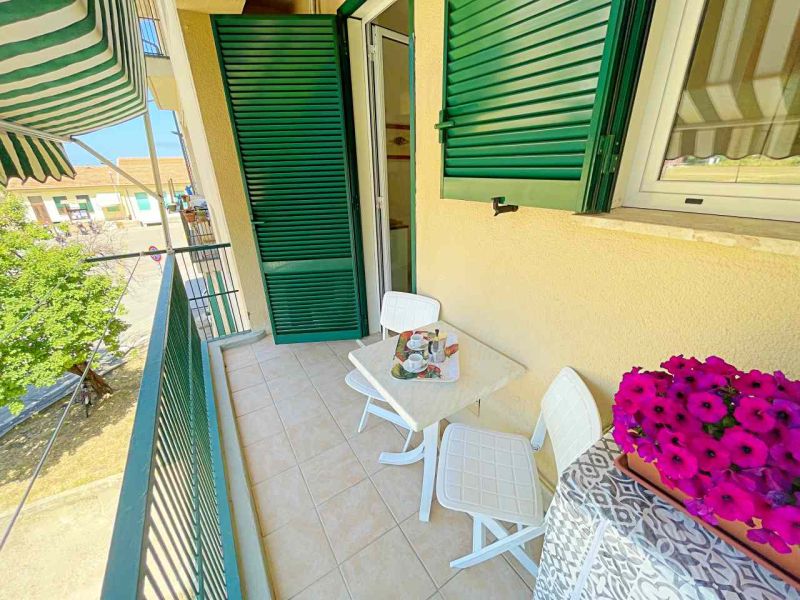 Bilocale a circa 100 m dalla spiaggia. Balcone. Primo piano. Aria condizionata. Camera con un letto matrimoniale ed uno singolo, soggiorno con un divano letto singolo ed angolo cottura. Bagno con doccia. Tv lavatrice, aria condizionata e posto auto.